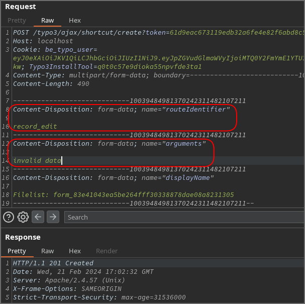 Um den DoS-Angriff durchzuführen, muss der Wert des Parameters „arguments” (ein gültiges Beispiel ist im folgenden Code-Block dargestellt) auf einen ungültigen Wert gesetzt werden. Ein ungültiger Wert ist jede Eingabe, die nicht im JSON-Format vorliegt oder kein edit-Attribut enthält, wenn routeIdentifier=record_edit.
