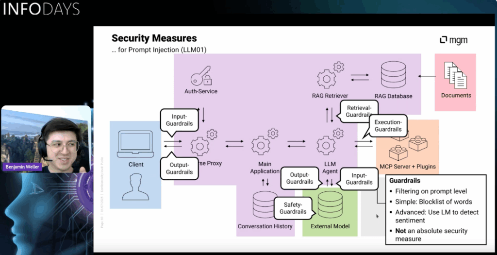 Anschließend konnten wir uns gemeinsam in einer ausgedehnten Q&A-Session mit den Teilnehmenden austauschen und über die gezeigten Schutzstrategien diskutieren. Es zeigte sich, dass bei den Teilnehmenden das Bewusstsein für die Notwendigkeit von Sicherheit im LLM-Bereich grundsätzlich vorhanden war, jedoch bei den Details der Schutzmechanismen noch Unklarheiten herrschten. Somit gab es dort echtes Interesse und auch zahlreiche Nachfragen, die wir alle klären konnten. Besonders deutlich wurde, wie wichtig fundiertes Wissen über Sicherheit und ein tiefgehendes Verständnis der LLM-Komponenten für die Einschätzung von Risiken und Schutzmaßnahmen sind.