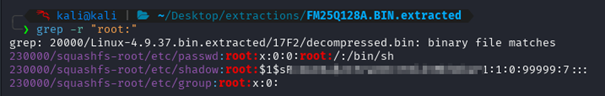 In der entpackten Firmware kann nun gezielt nach sensiblen Dateien gesucht werden. Der Passwort-Hash des Root-Benutzers befindet sich im ersten SquashFS-Dateisystem, beginnend ab Offset 0x230000 im Dump. (Bild)