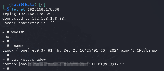 Nach dem Einlegen der modifizierten Speicherkarte in die Kamera, dem Startvorgang und einigen Sekunden Wartezeit, kann über Telnet auf das Gerät zugegriffen werden. Wie im untenstehenden Screenshot zu erkennen ist, erhält man dabei vollständigen Root-Zugriff auf das System.