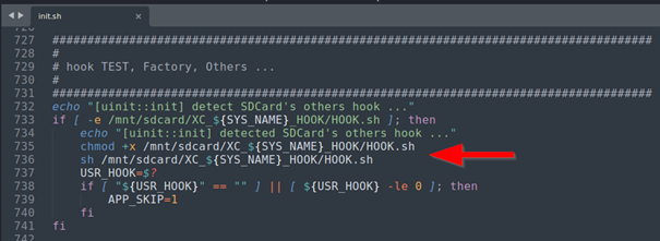 In der /etc/init.sh-Datei befinden sich mehrere sogenannte ‚Hooking‘-Abfragen, die offenbar zu Test- oder Debugging-Zwecken während der Entwicklungsphase implementiert wurden. In diesen Abfragen wird jeweils geprüft, ob bestimmte Dateien auf der SD-Karte vorhanden sind. Ist dies der Fall, werden u.a. Dateien mit Root-Rechten ausgeführt, Dienste wie Telnet oder RTSP gestartet, oder verschiedene Logdateien auf der Speicherkarte abgelegt.