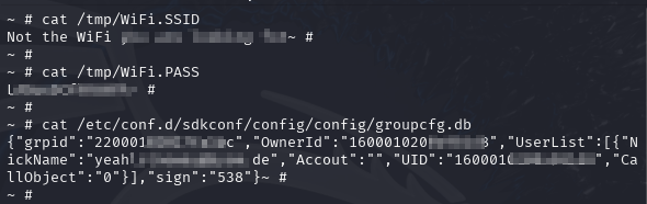 Mit maximalem Zugriff lassen sich nun auch sensible Daten auslesen. So sind die WLAN-Zugangsdaten in den Dateien /tmp/wpa.connect.conf und auch in /tmp/WiFi.SSID und /tmp/WiFi.PASS zu finden.